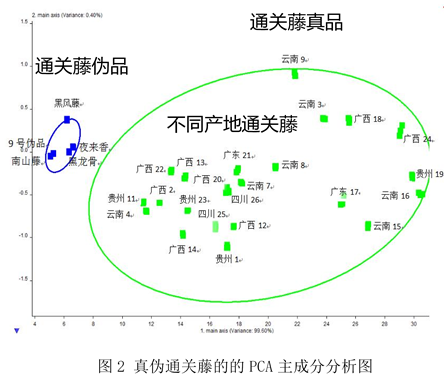 黑風藤、黑龍骨、南山藤等常被用來冒充通關藤。從圖2中可見,不同產(chǎn)地的通關藤在氣味上也有一定差異,偽品在氣味上與真品還是具有明顯差異的,通過電子鼻檢測可被非常清晰的區(qū)分開來