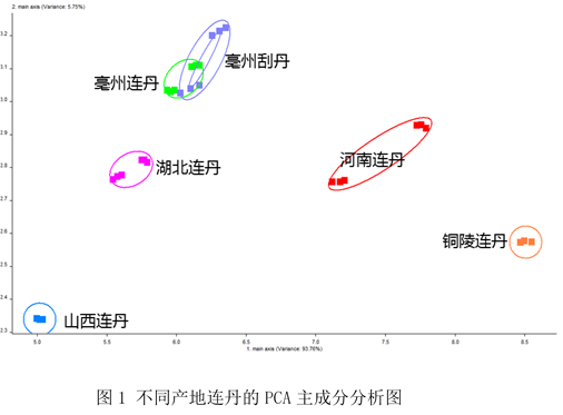 從圖1中可見不同產(chǎn)地生長的連丹在氣味上存在明顯差異,通過電子鼻可以完全的區(qū)分開來。相同產(chǎn)地得到的刮丹和連丹在氣味上則很接近。