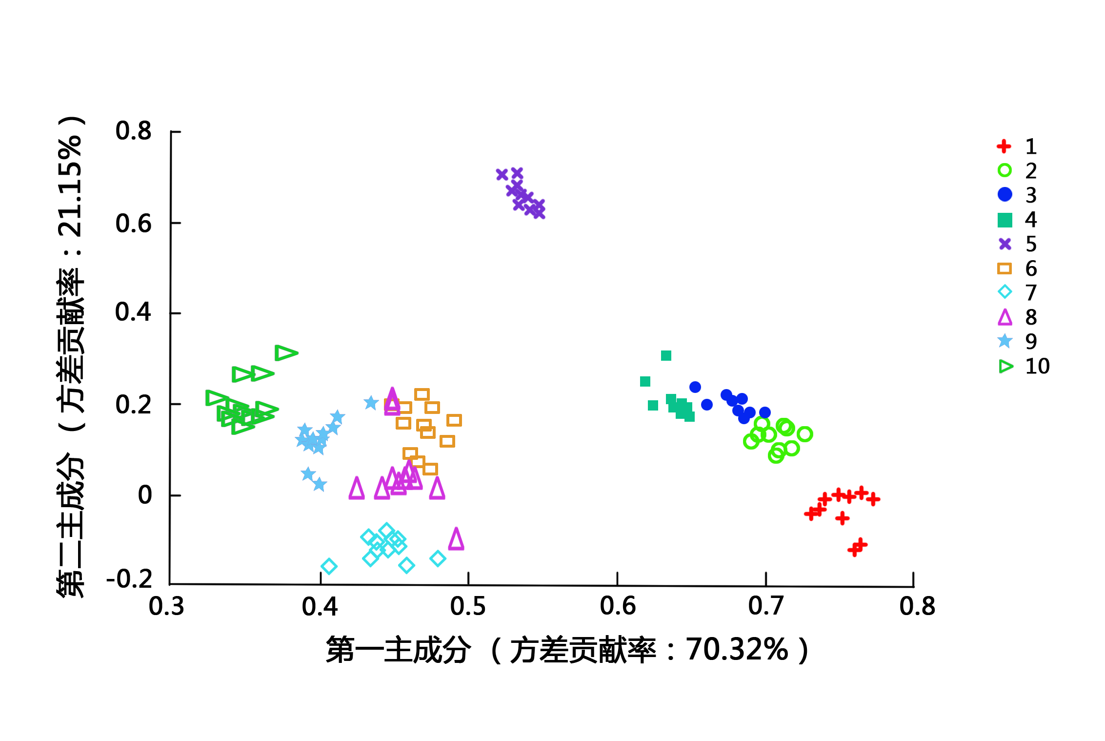 將兩個不同采收期的陽春砂很好的區(qū)分開來,如圖3所示,通過一條直線可以清楚地把2個批次不同采收期的陽春砂區(qū)別開來。通過此種方法對不同采收期的陽春砂進行分類鑒別,獲得較理想的結果。