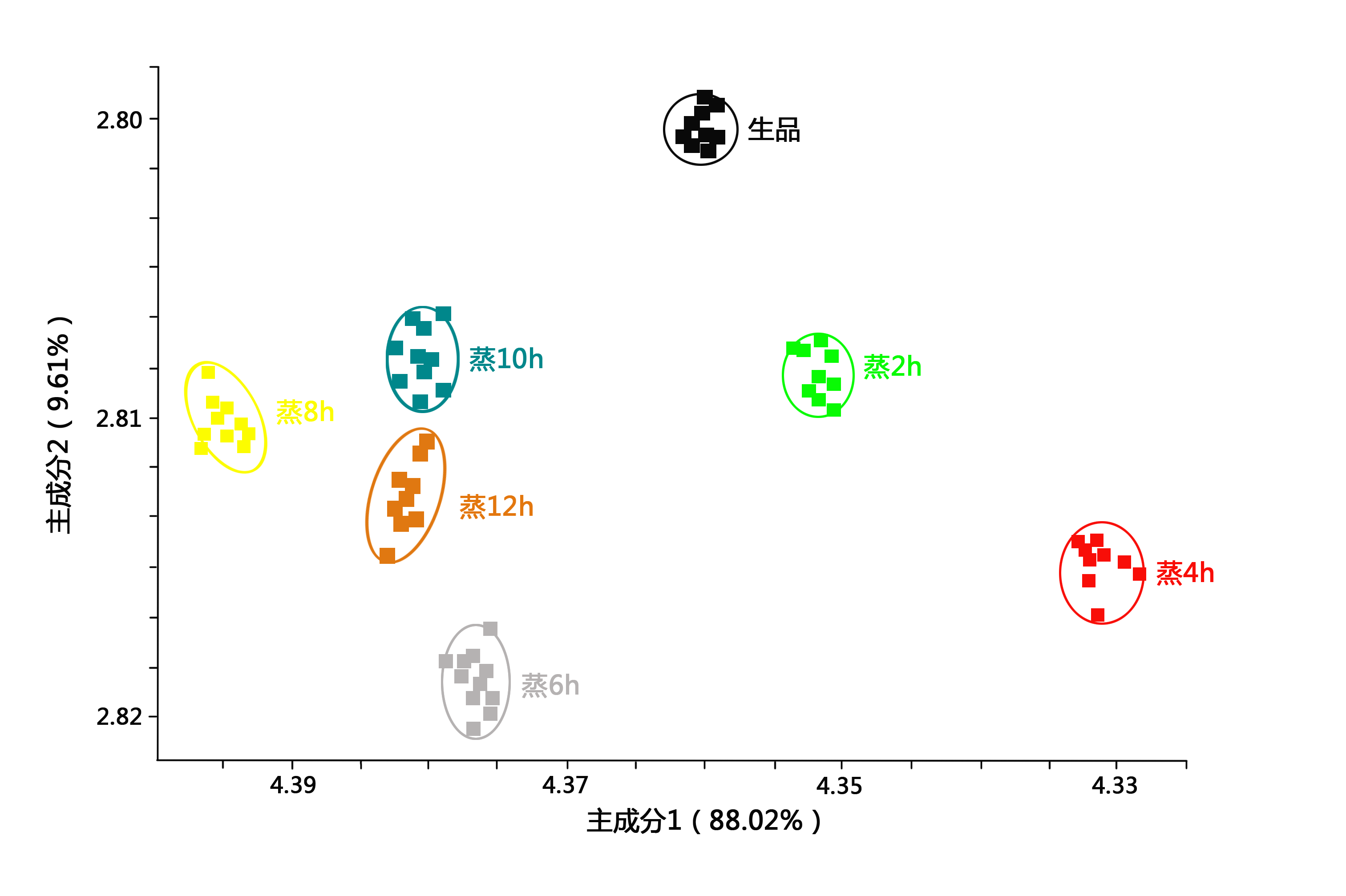 下圖反應了不同炮制階段制川烏的“氣”味發(fā)生了明顯變化,電子鼻將傳統(tǒng)的“氣”信息進行數(shù)字化表征,實現(xiàn)不同炮制時間的制川烏區(qū)分。