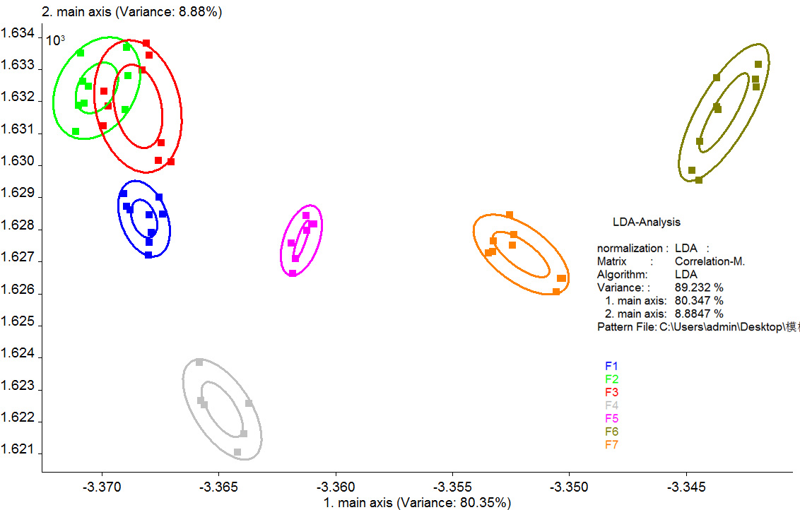 通過7 個顆粒劑樣品的LDA 線性判別分析看出,可以更好的比較幾個樣品在氣味上的差異,首先可見矯味后的樣品均集中在X 軸偏小的一側,未矯味F5、 F6 和F7與矯味后的產(chǎn)品被明確的區(qū)分開來,且F6 和F7產(chǎn)品差異更加顯著??梢姵C味后的產(chǎn)品整體的揮發(fā)性氣味偏小,未矯味的產(chǎn)品則異味明顯較大。
