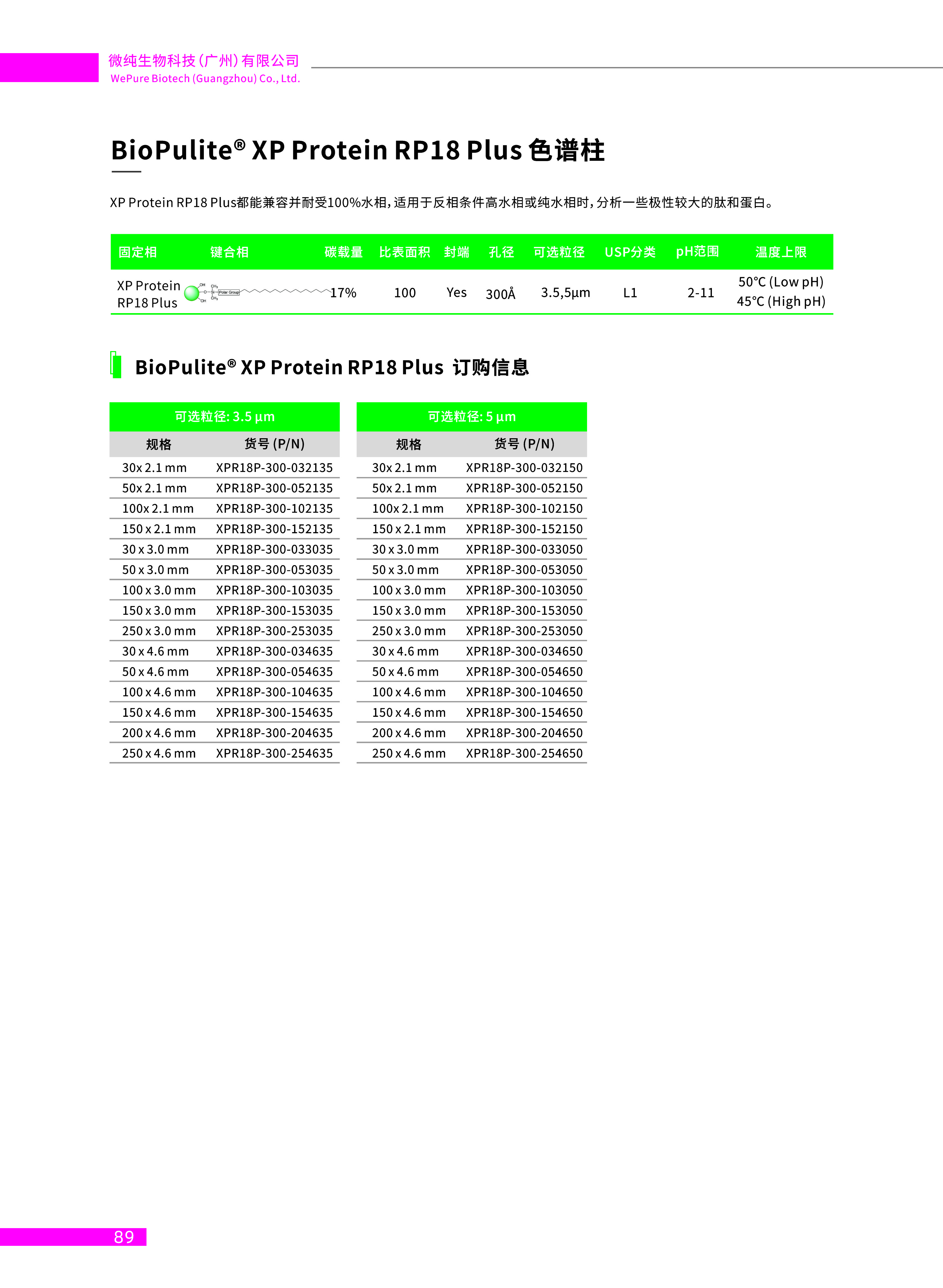 XP Protein RP18 Plus都能兼容并耐受100%水相,適用于反相條件高水相或純水相時(shí),分析一些極性較大的肽和蛋白。