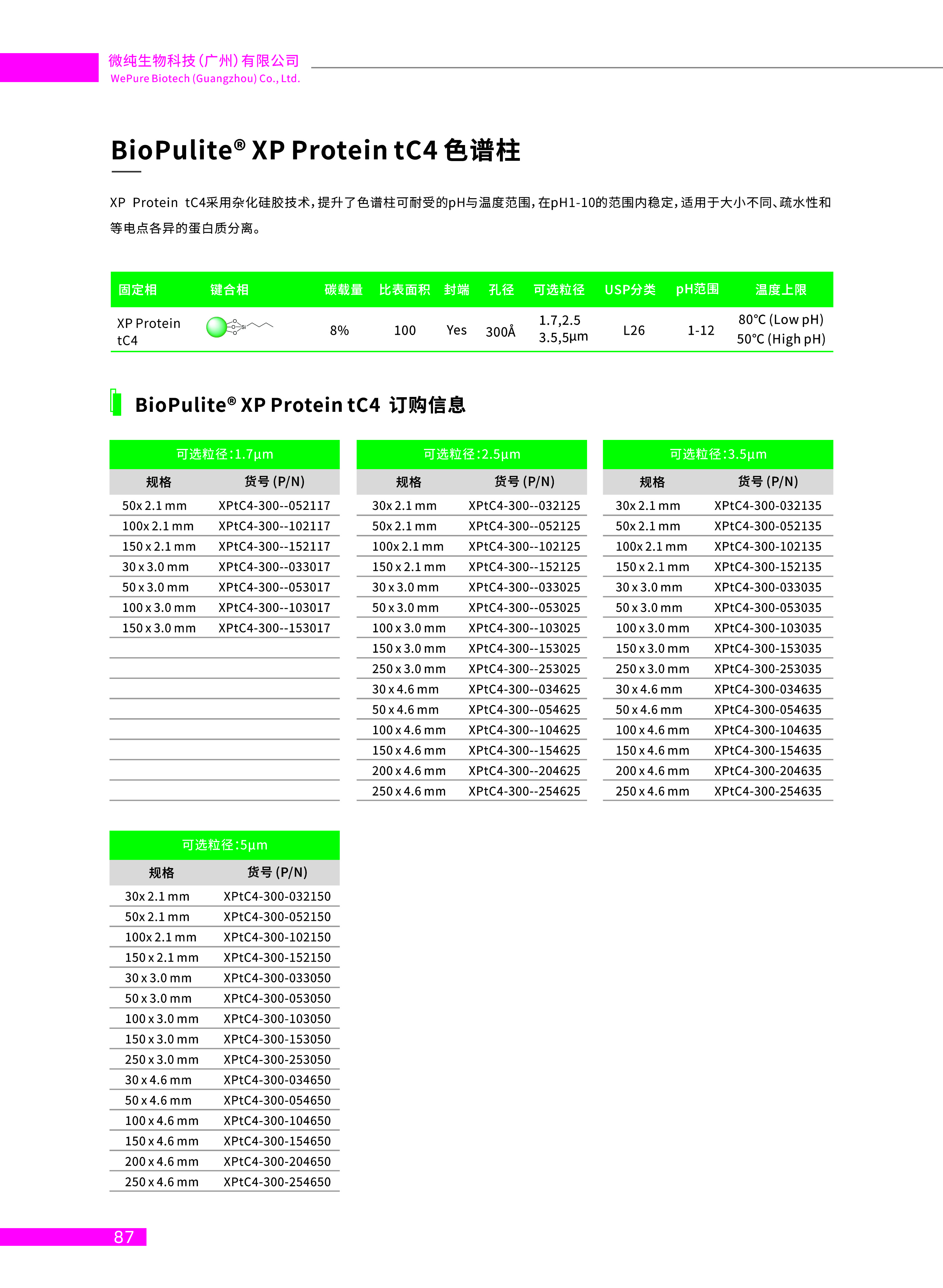 XP Protein tC4雜化硅膠C4色譜柱,在pH1-10的范圍內(nèi)穩(wěn)定,提升了色譜柱可耐受的pH與溫度,適用于分離大小不同、疏水性和等電點各異的蛋白質(zhì)分離。