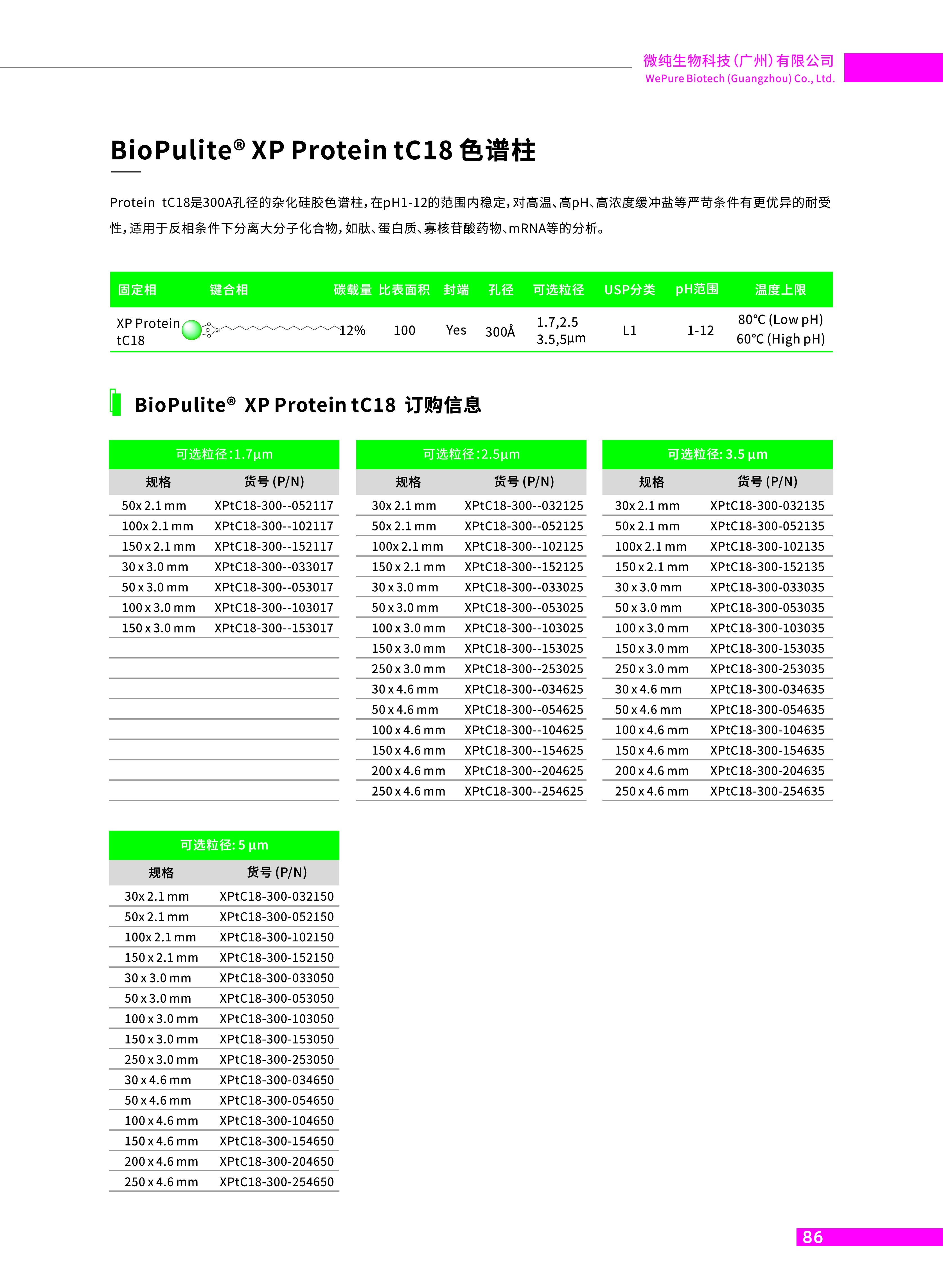 Protein tC18 是300?孔徑的雜化硅膠色譜柱,在pH1-12的范圍內穩(wěn)定,300A的大孔徑適用于大分子化合物如肽、蛋白質、寡核苷酸、mRNA等的分析。雜化硅膠填料,增強色譜柱對高溫、高pH、高鹽等條件下的耐受性,是反相條件下的理想選擇。