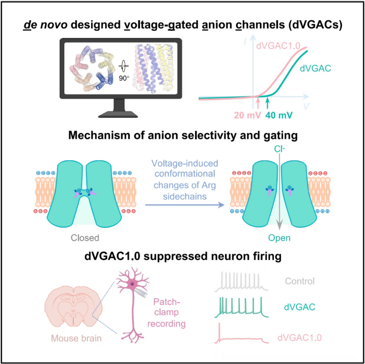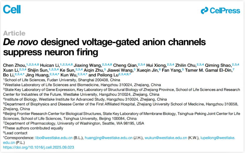 2025 年 10 月 16 日,西湖大學(xué)生命科學(xué)學(xué)院盧培龍團(tuán)隊(duì)(盧培龍?jiān)?nbsp;David Baker 實(shí)驗(yàn)室進(jìn)行博士后研究)等,在 Cell 期刊發(fā)表題為:De novo designed voltage-gated anion channels suppress neuron firing 的研究論文。