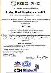 山東潤德生物科技有限公司成立于2014年10月,是一家以生物制品的研發(fā)、制造、方案服務為主導的國家高新技術企業(yè),先后榮獲國家科學技術進步二等獎、國家制造業(yè)單項冠軍示范企業(yè)、國家級綠色工廠、國家知識產(chǎn)權示范企業(yè)、國家工業(yè)產(chǎn)品綠色設計示范企業(yè)等榮譽資質,是國內首個氨基葡萄糖行業(yè)標準的第一起草制定單位和國內首個氨基葡萄糖國家標準樣品的第一研制單位。