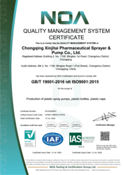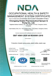 重慶鑫吉泰現(xiàn)已順利通過ISO9001質(zhì)量管理體系認證、ISO14001環(huán)境管理體系認證、ISO45001職業(yè)健康安全管理體系認證,ISO15378:2017藥包材質(zhì)量管理體系認證,以及ISO13485:2016醫(yī)療器械質(zhì)量管理體系認證。并取得了國家藥監(jiān)局的藥包材登記備案。鑫吉泰產(chǎn)品全部采用公認的醫(yī)用衛(wèi)生級聚丙烯和聚乙烯塑料為原料,噴霧泵產(chǎn)品采用獨特的無珠式結(jié)構(gòu),結(jié)構(gòu)精密,故障率低,相關(guān)產(chǎn)品技術(shù)經(jīng)過了近30年的成功驗證。